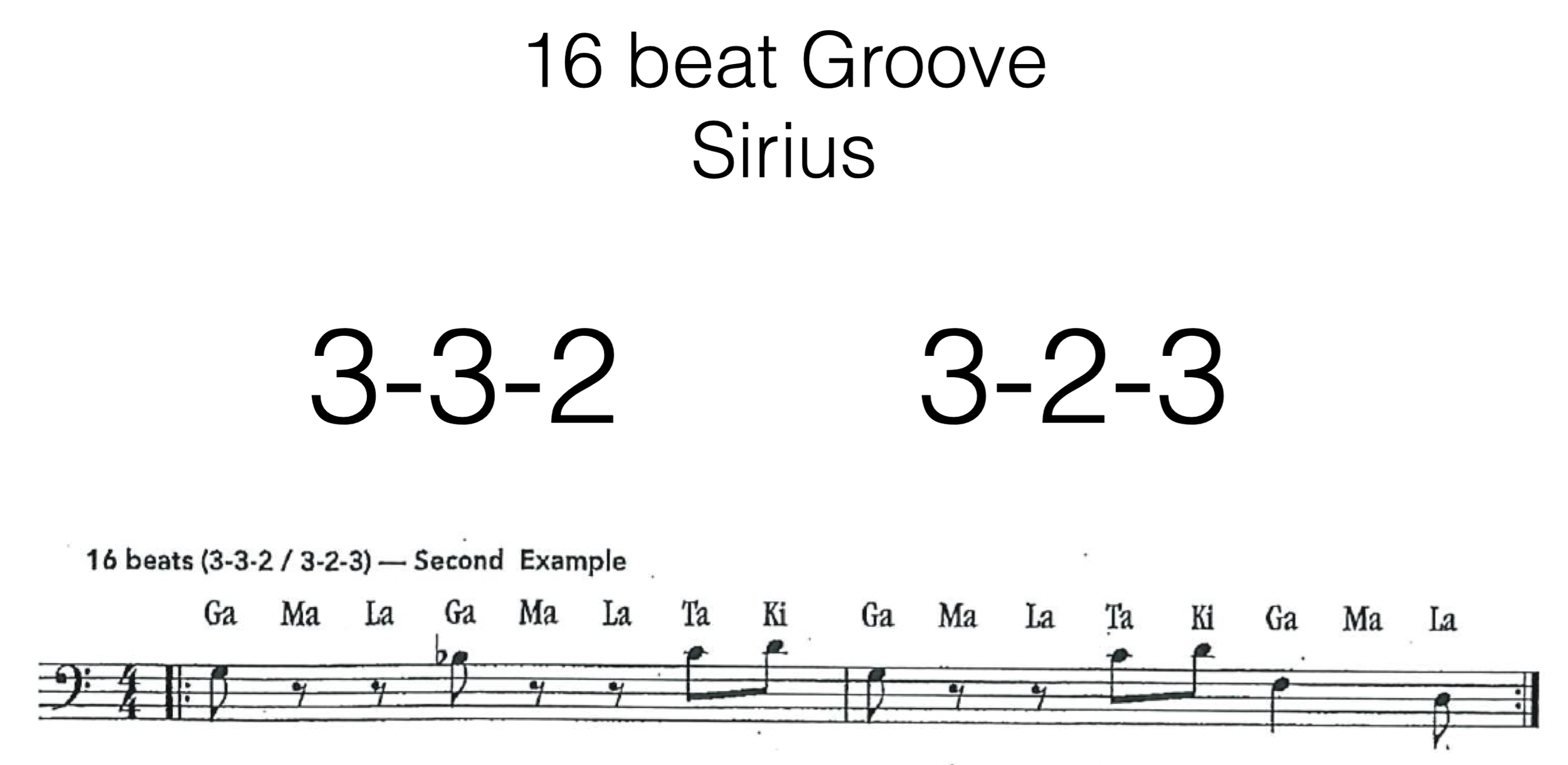 Sirius Bass Part — 16 beats, 8 + 8first eight is 3 3 2, second eight 3 23 Space is the Place - Sun Ra anthem/hymn